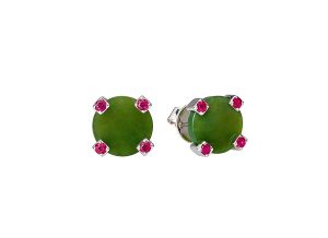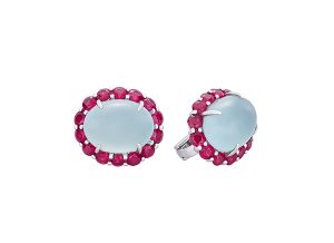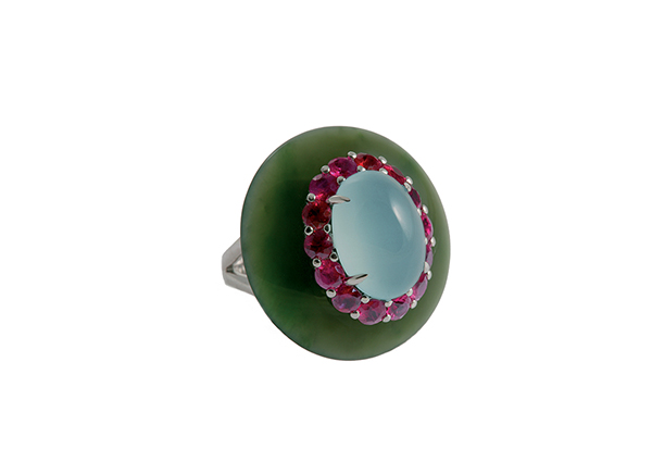 18K white gold with nephrite jade, aquamarine and rubies