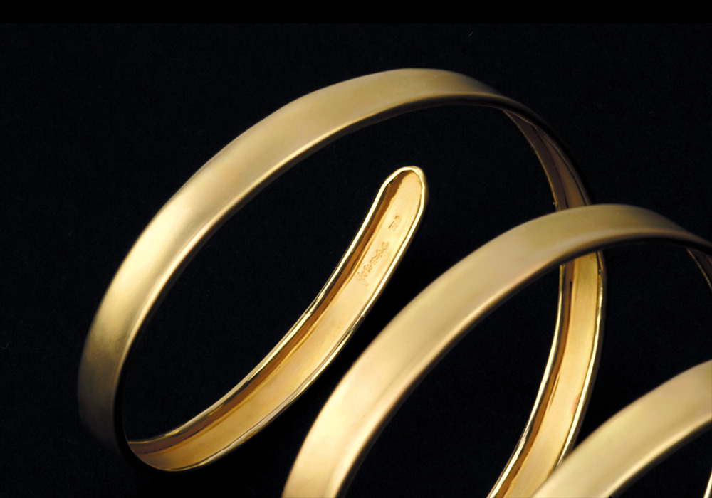 Another signature collection designed in the year 2000. A gold ribbon that elongates into a snake cuff, curves into the semainier set of 7 bangles or becomes a pair of rings.