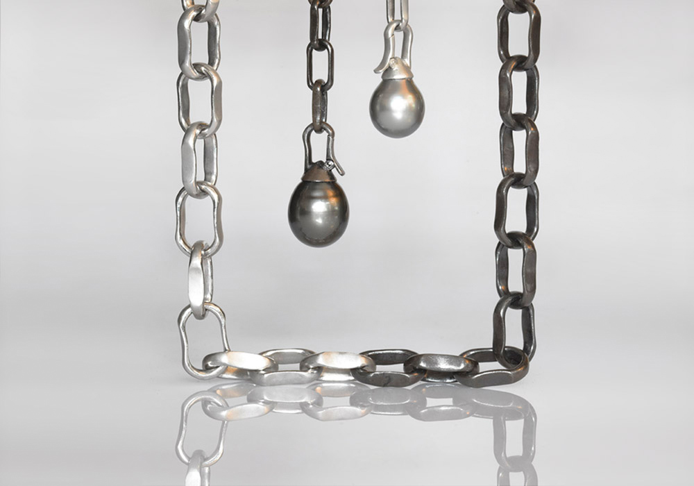 Contrasting the preciousness of beautiful South Sea pearls set in gold with the boldness of a sterling silver chain, Youmna drew her inspiration for this necklace from the gracious neckline of a swan. The pearl setting mimics the elegant line of the bird’s neck from which the chain follows to curve around the wearer’s neck. The spelling of Swann is a wink to Marcel Proust’s book “Swann’s way” in “In Search of Lost Times”.